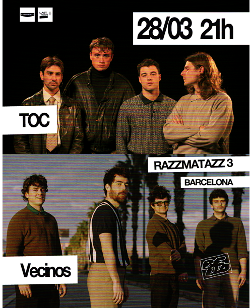 ¡Barcelona se prepara para recibir los grupos del momento! Vecinos y TOC compartirán escenario y nos harán vivir un concierto para recordar. Nacidos en la ciudad condal, pero con alma de calle, Vecinos nos traen su cóctel de punk, pop y garaje, junto a esas ganas de cantar a pleno pulmón. A su lado, TOC llegan desde Euskal Herria a sacudir la ciudad con su energía basca y su universo postpunk, mod i Oi!.