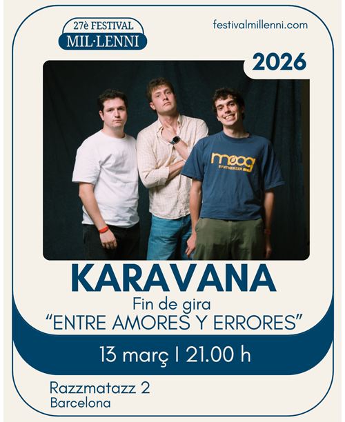 Karavana és el grup madrileny format per en Gonzalo, l’Emilio i en Jaime, que amb només una cançó ja et tenen enganxat. El seu pop rock directe i desenfadat, amb guitarres esmolades i lletres que connecten amb tota una generació, sona a himne des del primer acord. Acaben de treure Entre Amores y Errores, un segon disc ple d’energia, sinceritat i melodies que no marxen fàcilment. Han passat pels grans festivals com el FIB, BBK o Sonorama, i els seus concerts són una festa en tota regla. Diuen que fan “guitarres brutes i lletres cursis”, però la seva proposta és molt més: actitud, emoció i un bon cop de realitat.
