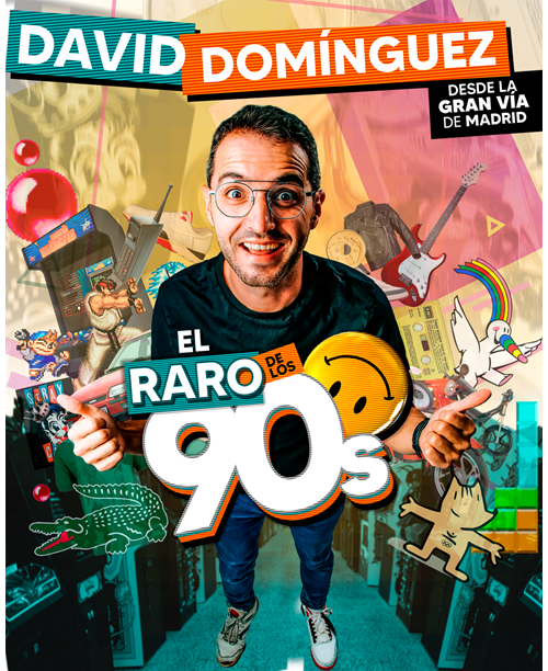 David Domínguez es un tío feliz (pero no feliz porque sea feliz, sino porque se entrena todos los días para serlo). «El RARO de los 90» es un espectáculo de humor en el que David Domínguez da un repaso en tono irónico, simpático y gamberro a sus vivencias en la maravillosa década de los 90. Con ese don que lo caracteriza para hacer reír cuenta situaciones irónicas y divertidas. Un espectáculo donde saca a la luz sus mejores textos que lleva escribiendo y probando 15 años y ahora se hacen realidad en este espectáculo.