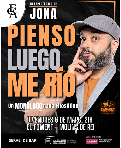 JONA, un còmic català amb un accentàs molt del sud, presenta el seu espectacle «PIENSO, LUEGO ME RIO», on la lògica desapareix, la realitat trontolla, l’absurd desafia la coherència i allò quotidià es converteix en un cúmul de preguntes sense resposta.