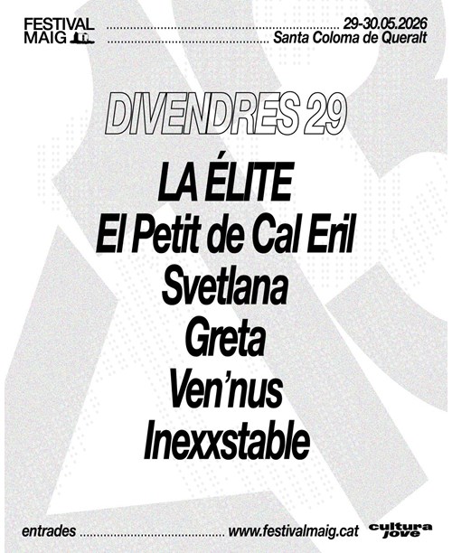 El Festival MAIG és l’esdeveniment cultural de referència de la Baixa Segarra que celebra a Santa Coloma de Queralt la seva 13a edició els dies 29 i 30 de maig amb una programació excepcional que combina artistes consagrats amb músics emergents del panorama musical català. Apostem per una cultura descentralitzada i per posar en valor el món rural com a un espai de trobada per celebrar la cultura, el coneixement i la vida. Després de més d’una dècada d’història, el Festival Maig continua consolidant-se com una de les cites musicals imprescindibles de la Catalunya interior, concerts entre camps de blat, natura, i una selecció d’artistes de primer nivell per a tots els públics i sensibilitats. La Catalunya rural no és només una postal, és una forma de viure i és la nostra.