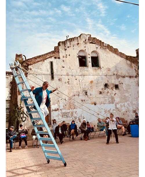 Fràgils construccions amb bidons, doma d’escales en equilibri, cossos contundents manifestant una contradictòria lleugeresa en el moviment, xerrameca absurda —al mateix temps que profunda i poètica— acompanyant les accions.