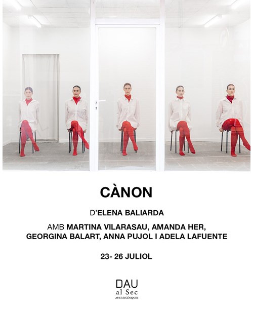 Cànon explora els múltiples significats de la paraula cànon, posant en qu?estió les normes establertes al voltant del cos, la bellesa i la pertinença social de la dona. A través del moviment, la repetició i la composició escènica, la peça fa visible la pressió d’adaptar-se a un model preestablert i la tensió entre el que som i el que s’espera de nosaltres.