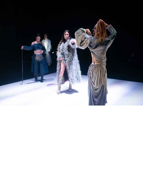 DIVES DESUBICADES, ARTISTES MARTIRITZADES,VIRTUOSITAT A MITGES. UNA CANTANT QUE CANTA AMB AUTOTUNE, I ENCARA AIXÍ CANTA MALAMENT. Quatre persones interactuen amb els mecanismes visibles d’un teatre que és un cos, delimitant-lo com a territori de conflicte. Les intèrprets corporitzen el desig de ser una cosa diferent a una mateixa, provocant una voràgine de judicis i identitats que ho trenca tot i celebra l’errada. VULL SER UNA CÒPIA BARATA D’UNA ALTRA PERSONA, TINC UN ÀNIMA DE PLÀSTIC, TANT LI FOT. Una conversa superficial i un discurs teòric interminable se superposen en capes que interactuen entre elles donant lloc a una il·lusió de pantalla dividida.